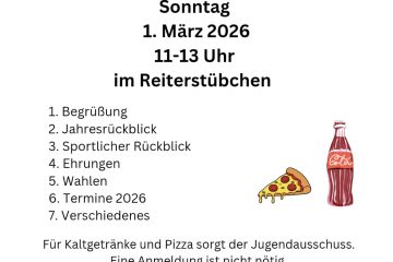 Am 01. März 2026 lädt der Jugendausschuss zur diesjährigen Jugendversammlung im Reiterstübchen ein. Die Veranstaltung beginnt um 11 Uhr und endet gegen 13 Uhr. Programm Eine Anmeldung ist nicht nötig.