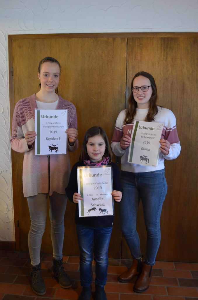 Nachdem alle Höhepunkte und sportlichen Ereignisse aus dem Jahr 2019 an die Leinwand geworfen worden waren, wurden Maren Kammann, Hanna Reinermann und Amelie Schwarz als beste Reiterinnen geehrt. Auch unsere Voltimannschaft Senden 6 durfte sich über eine Auszeichnung als erfolgreichste Mannschaft freuen. Erfolgreichstes Voltigierpferd war übrigens Gloria – eine Karotte für diese Leistung.