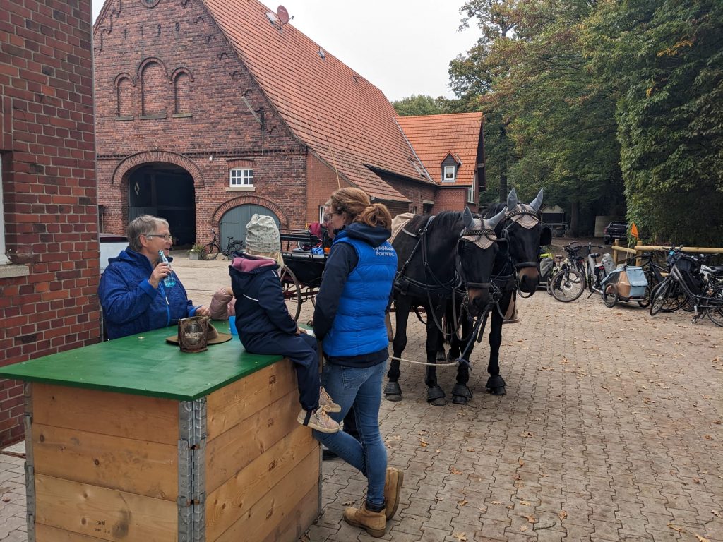 Die erste Station lag auf dem Hof Große Scharmann, wo die Teilnehmer eine kurze Pause einlegten. Weiter ging es zum Hof Hernsel, wo die traditionelle Erbsensuppe zum Mittag auf alle wartete. Danach führte die Strecke zum Hof Emschove, bevor es zurück zur Reithalle ging.