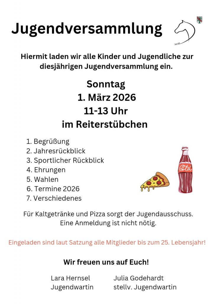 Am 01. März 2026 lädt der Jugendausschuss zur diesjährigen Jugendversammlung im Reiterstübchen ein. Die Veranstaltung beginnt um 11 Uhr und endet gegen 13 Uhr.